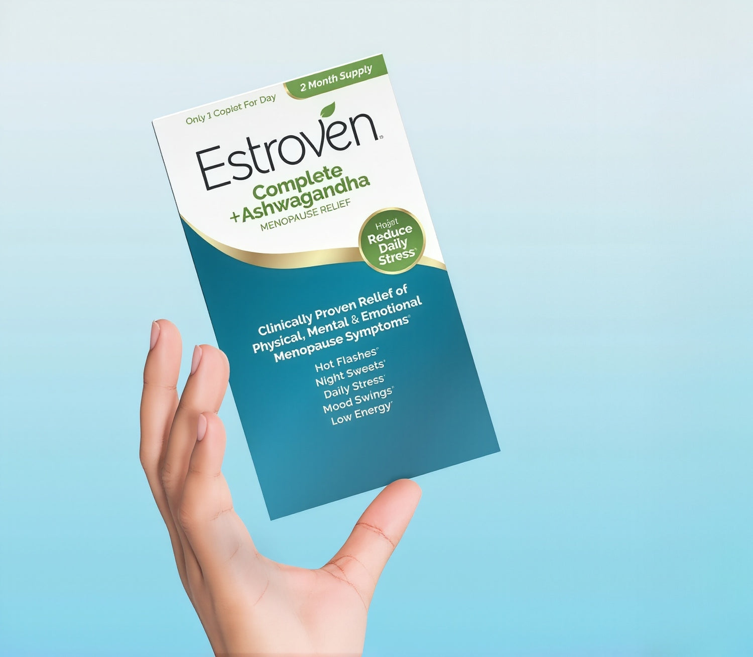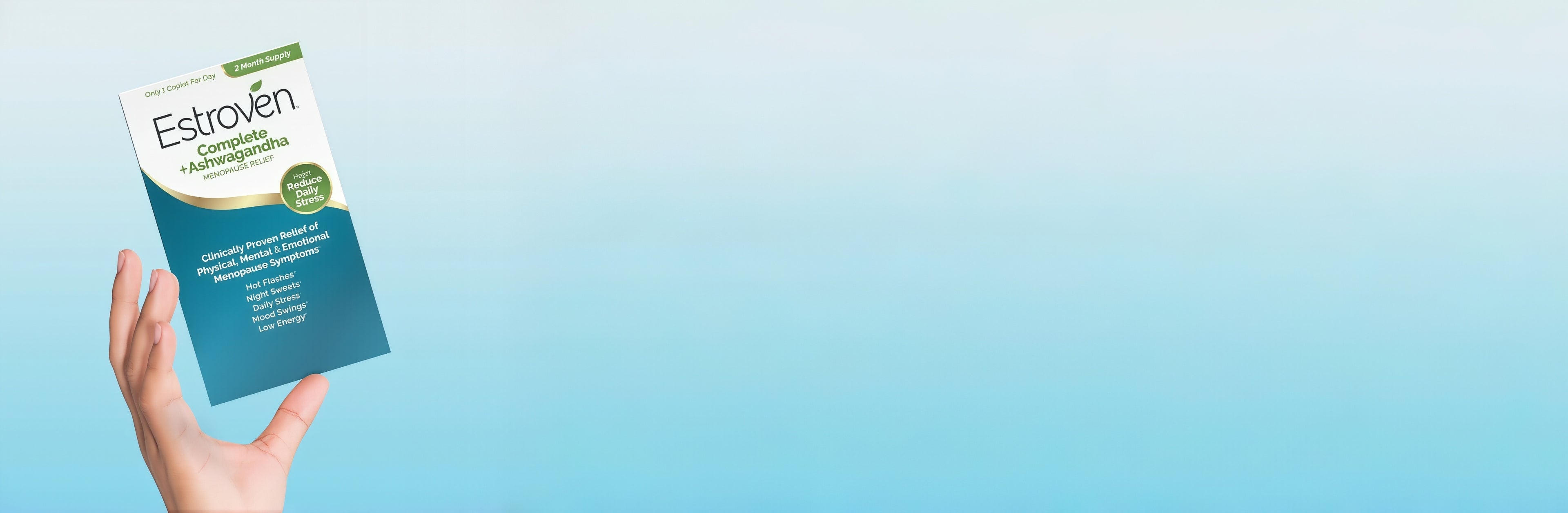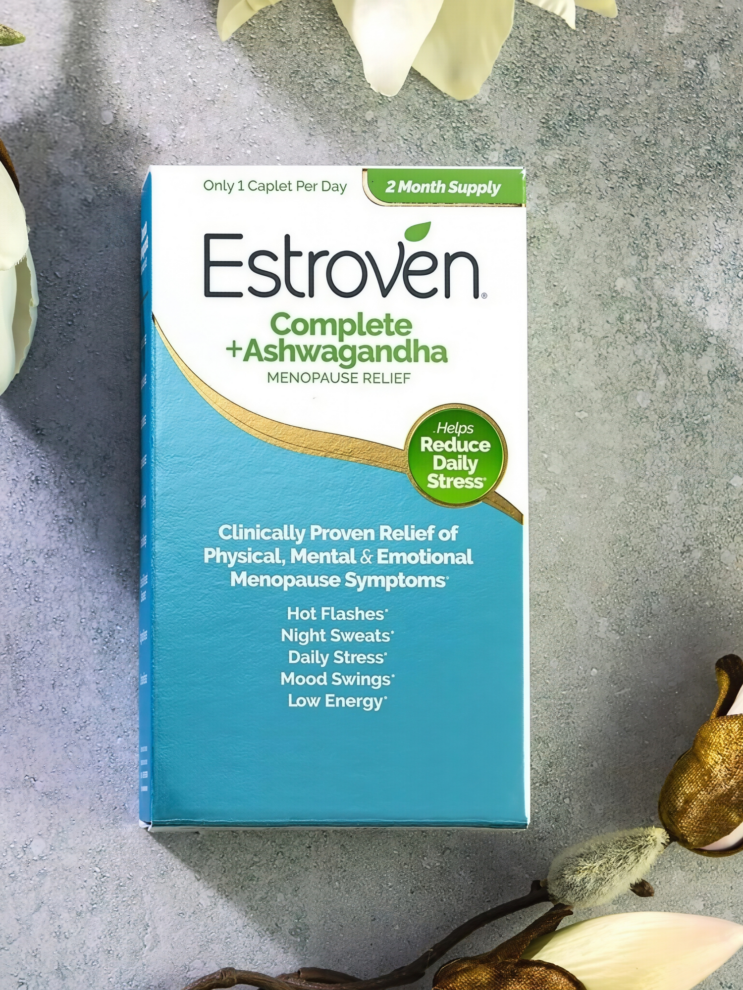 Please storeEstroven® Complete + Ashwagandhaat room temperature. Do not expose to excessive heat, humidity or direct sunlight.